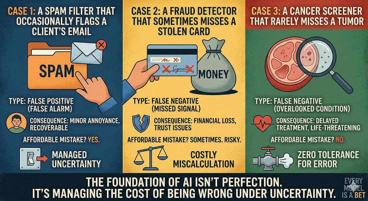 Identical accuracy can be catastrophic in one case and trivial in another. Why? Because the costs of false positives and false negatives are wildly different. AI’s basis is to turn those asymmetries into math and policy: define loss, choose thresholds, and design fallbacks that minimize expected harm.